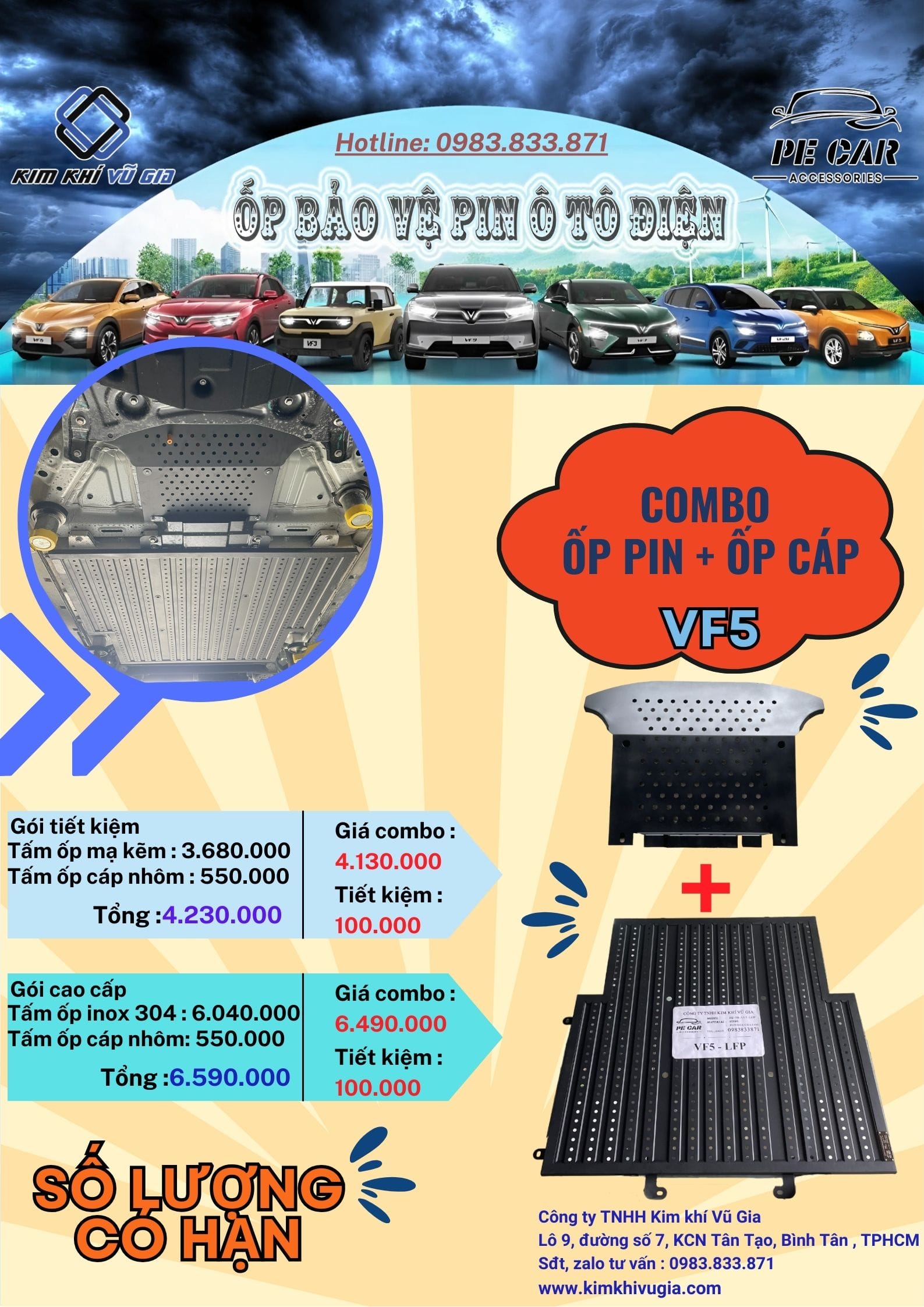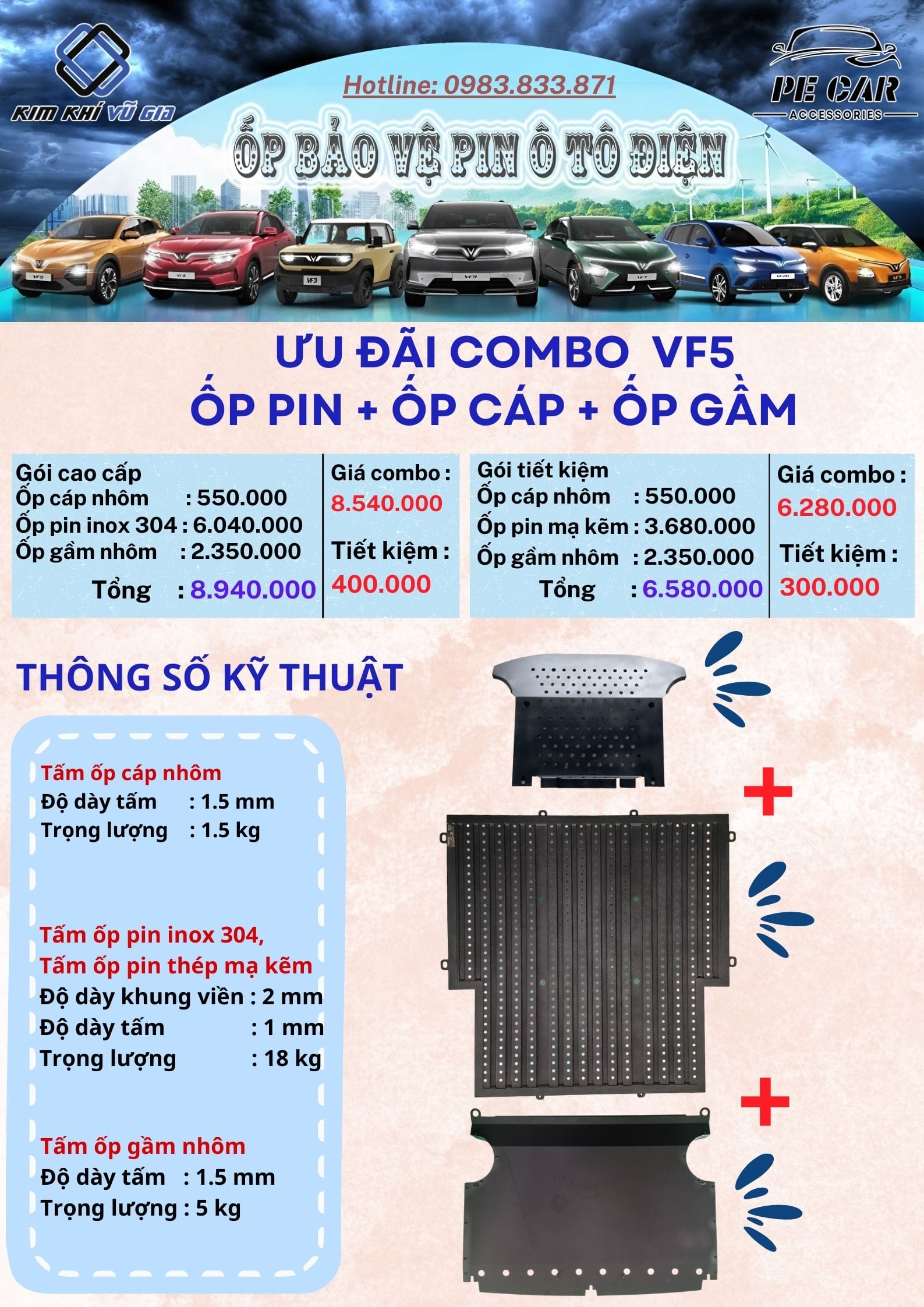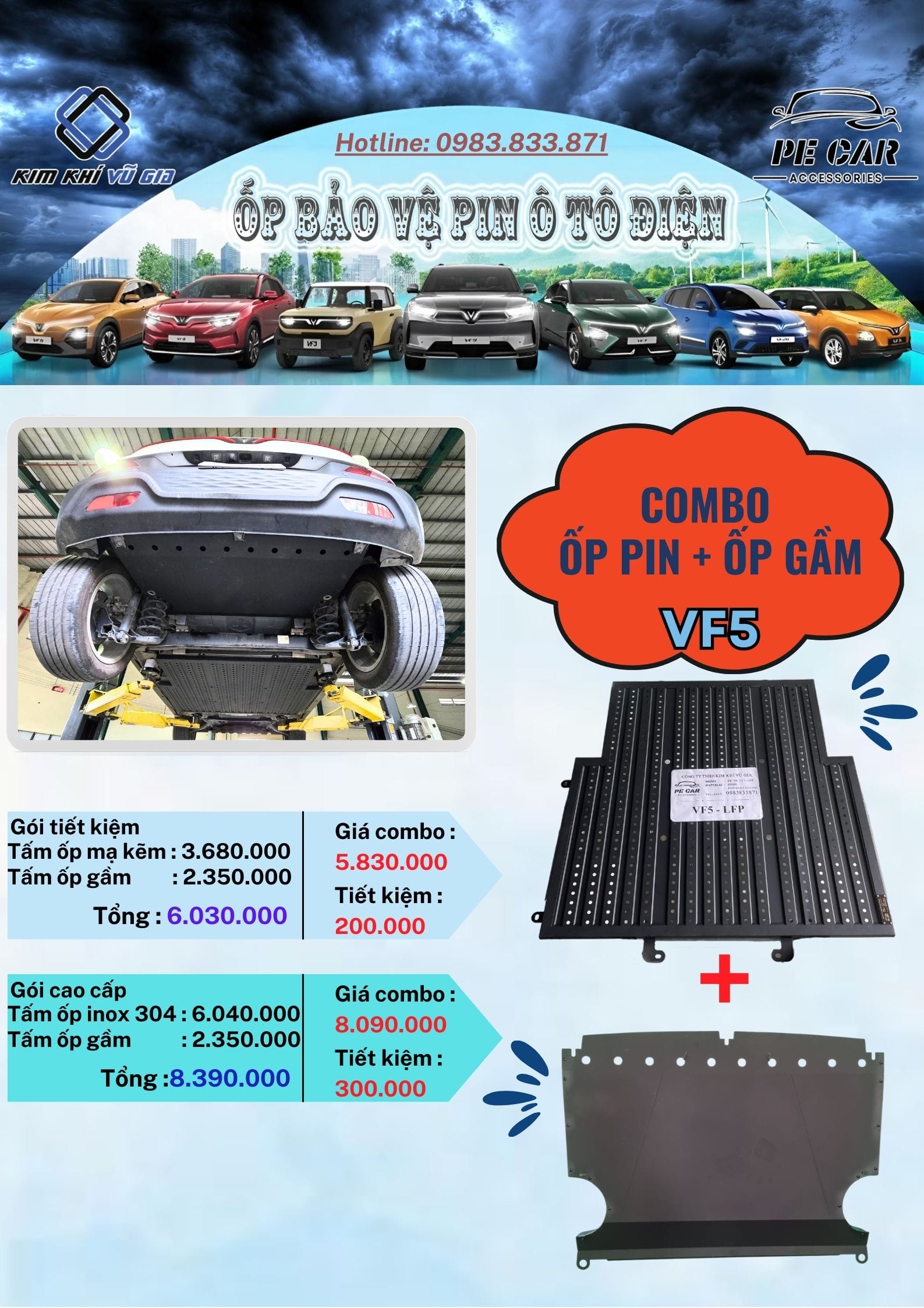 Ốp pin VF5 được thiết kế chuyên dụng cho xe điện VinFast VF5, giúp bảo vệ tối ưu bộ pin khỏi các tác động cơ học, va chạm phần pin . Sản phẩm được sản xuất từ vật liệu inox 304 cao cấp và thép mạ kẽm sơn tĩnh điện, đảm bảo độ bền vượt trội, khả năng chống gỉ sét và chịu lực tốt.